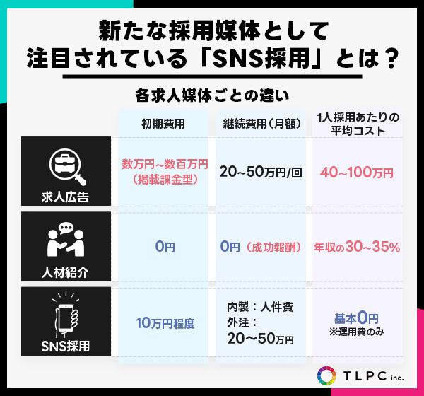 また、SNS採用の最大のメリットは従来の採用手法と比べて、採用コストが運用費だけで比較的安く済む点です。