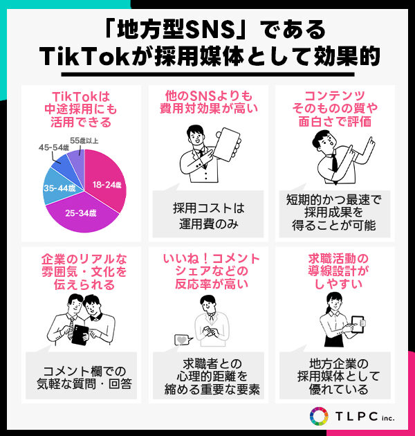 特にTikTokのようなレコメンド機能が強力なプラットフォームでは、企業のことを全く知らなかったユーザーにもコンテンツが届きやすく、地方にいながら全国の潜在的な候補者にリーチすることも夢ではありません。