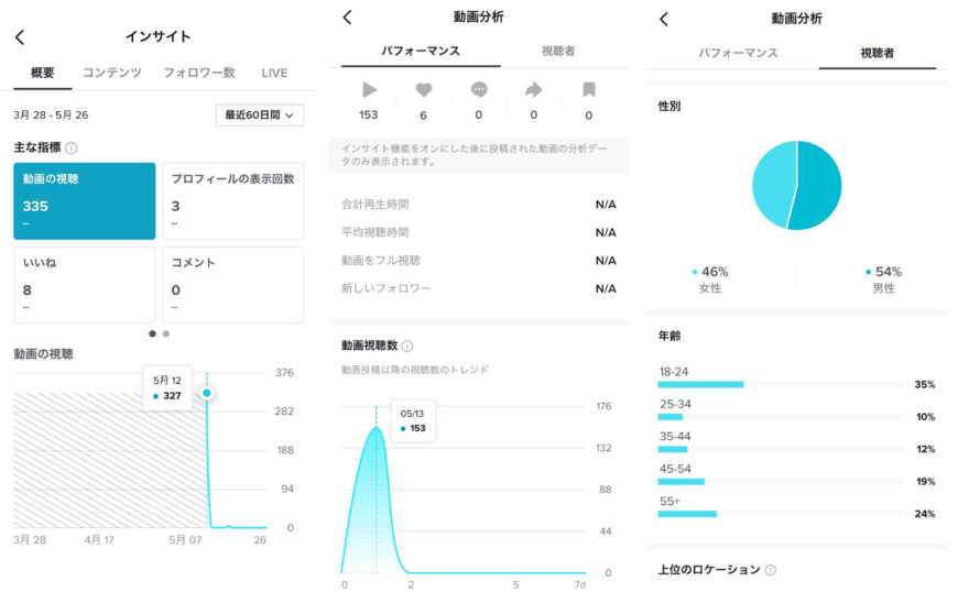 TikTokマーケティングで欠かせないツールの一つが、TikTokビジネスアカウントのインサイト機能です。特に注目すべきデータとして、以下の項目があります。